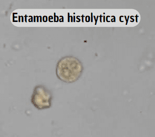 - ضع غطاءالشريحة (Cover) وافحص العينة تحت الميكروسكوب مستعملا العدسة الشيئية X10 ثم بع دذلك بالعدسة الشيئية X40 محاول االعثورعلي الطفيليات وحيدةالخلية ثم بعدذلك ضع نقطة من محلول اليود المائي وذلك حتى يسهل التعرف علي أكياس الاميبا لأنها تأخذ لون اليود دون غيرها.